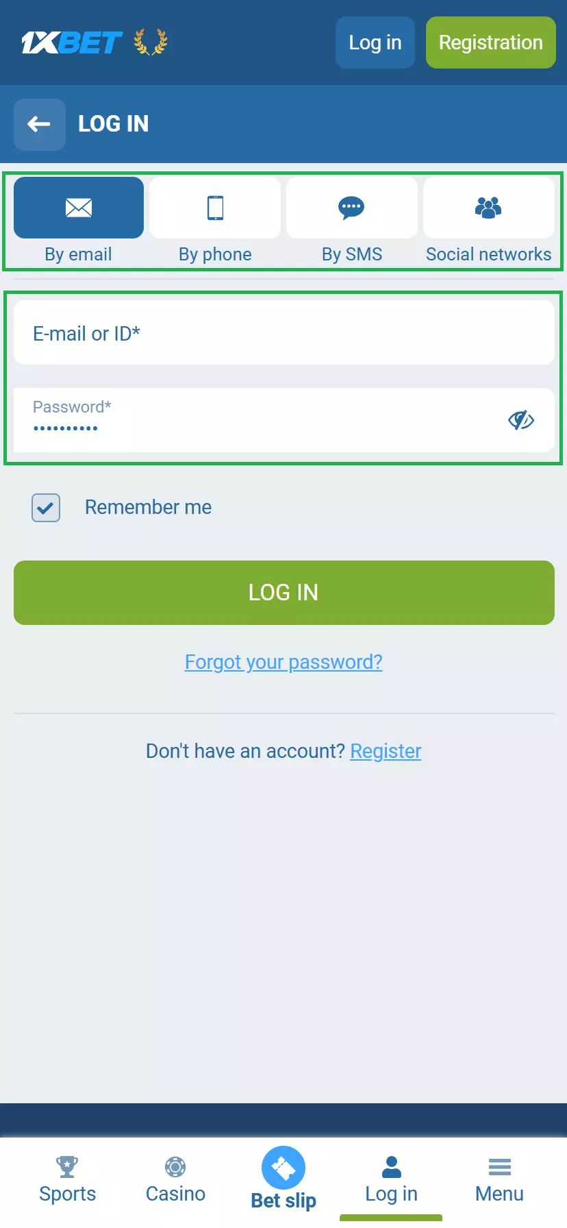 The login process at 1xBet is the same as on all similar services: enter your email address (phone number) and password. Simple.