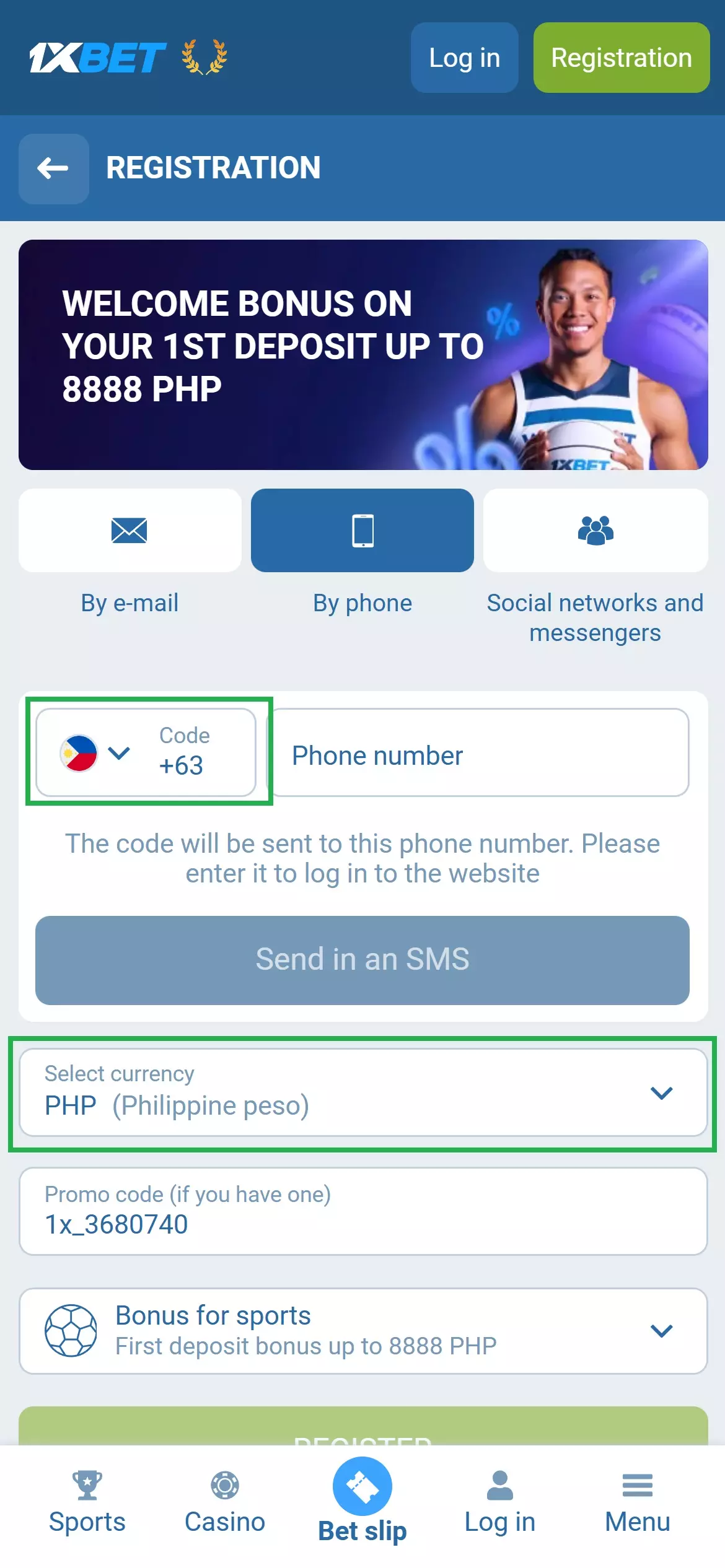 Click “Registration” on the 1xBet app or website. Ensure that the Philippines is selected as your country and that your account currency is Philippine Peso (PHP). Changing your country or currency later may affect the promotions available to you.